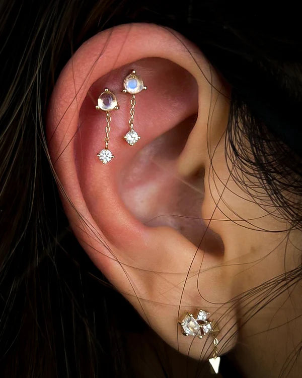 - Gemstone: (1) 3 x 2.5mm Blue Moonstone Cab and (1) 2mm White Sapphire