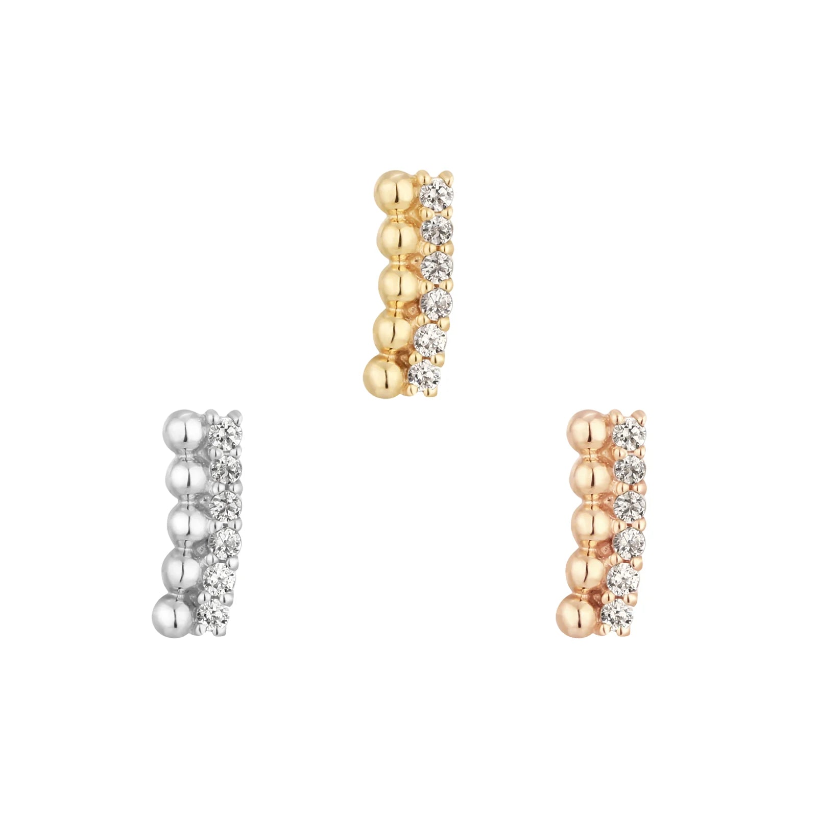 The Prophesy threadless end offers a beautiful and unique style perfect for lobe, helix, and tragus piercings. It's crafted from solid 14k gold and embellished with six shimmering Swarovski CZs.