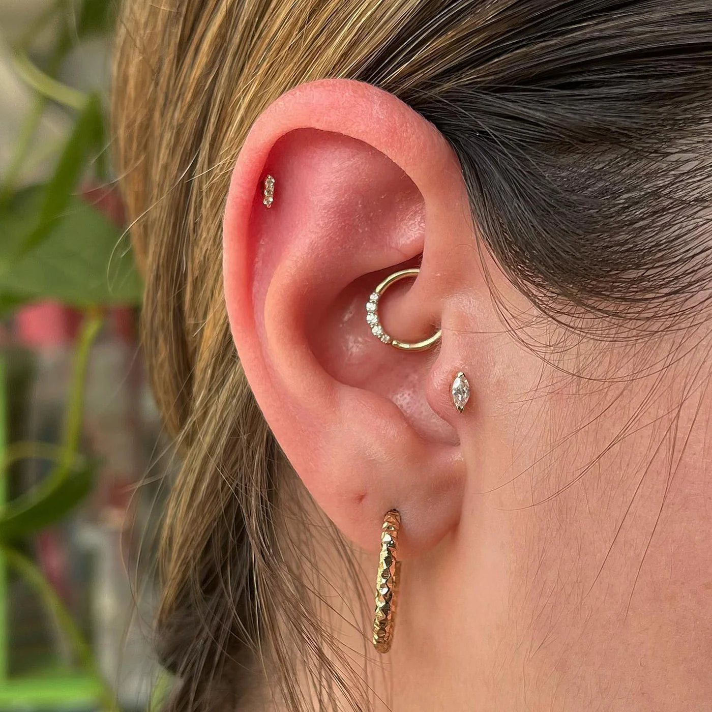 - Gemstone: (1) 1.5mm, (2) 1.3mm, and (2) 1mm round cut Swarovski CZs