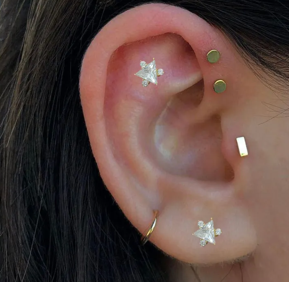 Introducing our "Triangle Elegance" 16g Threaded End in radiant 14kt gold. This intricate piece features a mesmerizing triangle Swarovski crystal, delicately cradled by three prongs adorned with additional Swarovski crystals.